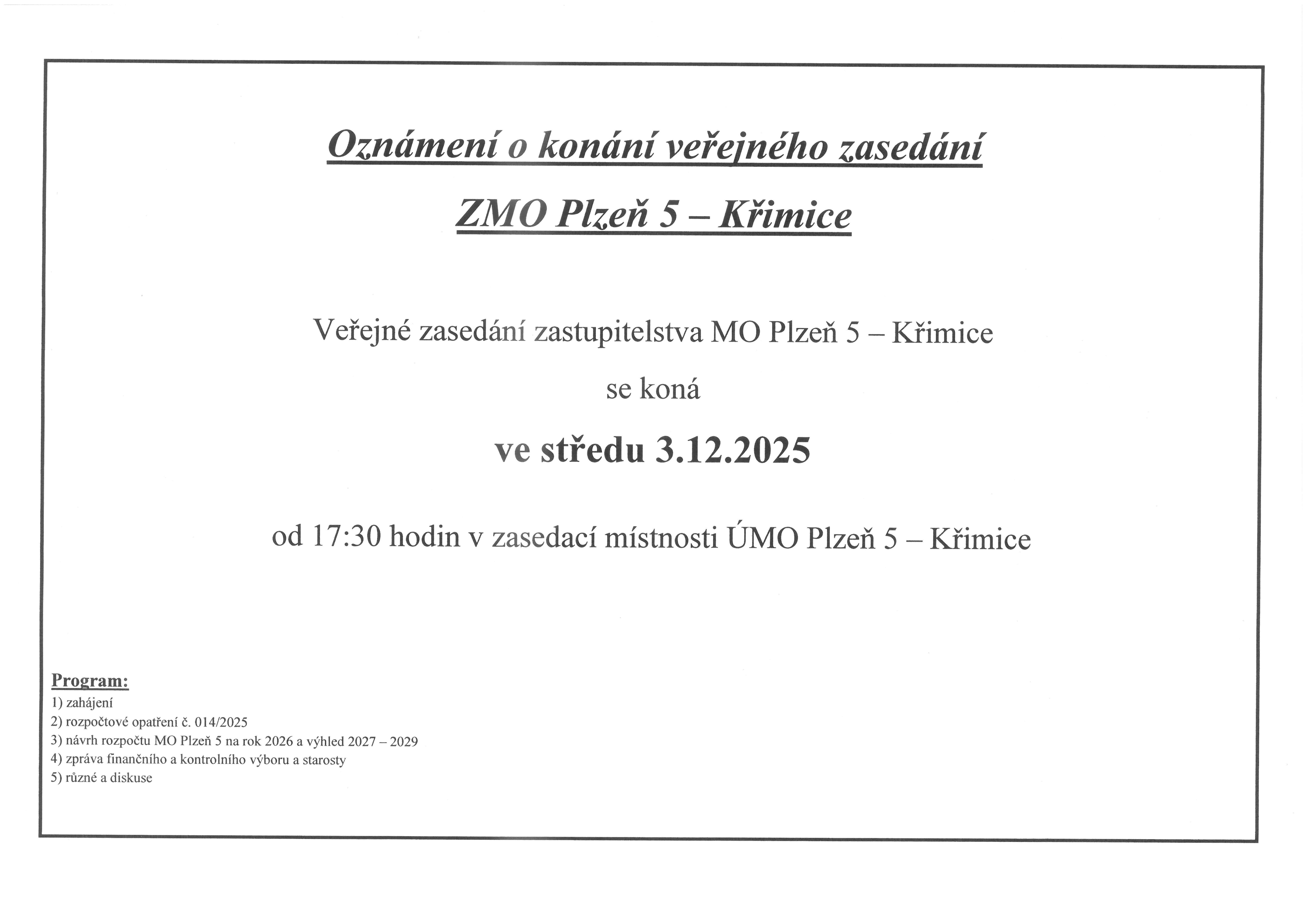 Starosta Městského obvodu Plzeň 5 Křimice zve na veřejné zasedání zastupitelstva městského obvodu, které se koná
